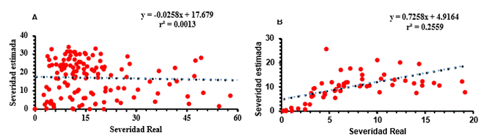 0.01. La precisión de las estimaciones obtenidas se evaluó con base al coeficiente de determinación (r2), exactitud y los errores absolutos (severidad estimada menos la severidad real) (Nutter et al., 2006) obtenidas con un análisis de regresión lineal simple con el software SAS® versión 9.0 (Tang, 2020), tomando en cuenta a la severidad real como la variable independiente y la estimada como dependiente.