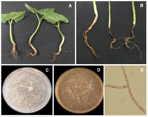 Figura 1 Rhizoctonia solani AG-7 causante de pudrición de la raíz del frijol común. A. Síntomas en tallos y raíces infectados naturalmente. B. Síntomas en plantas inoculadas artificialmente, 30 días después de la inoculación. C. Colonia en PDA después de 7 días a 25 °C en oscuridad. D. Colonia en PDA después de 20 días. E. Hifas teñidas con Safranina-O que muestran células multinucleadas y ramificación en angulo recto y constreñida ligeramente en su base.