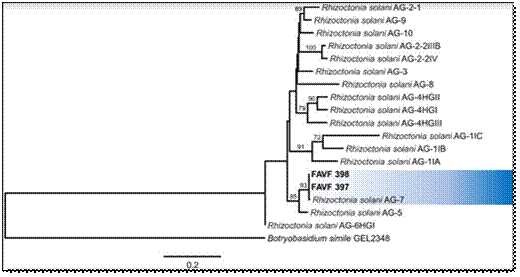 The isolates FAVF397 and FAVF398 were molecularly identified as Rhizoctonia solani AG-7 and are responsible for the root rot of common bean.