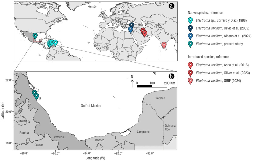 Figure 1 Distribution of Electroma vexillum as a native and introduced species (a). Coasts of Tuxpan (A) and Cazones (B) in the Gulf of Mexico (b).