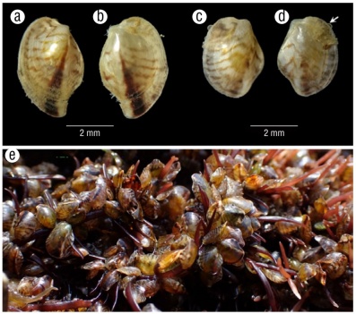Figure 2 Two individuals of Electroma vexillum collected from benthic marine algae on the groins of Tuxpan, Veracruz. The first individual is 4 mm long: dorsal valve (a) and ventral valve (b). The second individual is 3 mm long: dorsal valve (c) and ventral valve (d). The byssus filaments are visible (white arrow). Aggregation of E. vexillum on red algae (e).