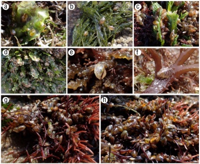 All bivalves were found associated with different species of green and red algae (Fig. 3). In the Tuxpan coastal groins, E. vexillum was observed as an epibiont on 4 species of green algae: Ulva lactuca Linnaeus, 1753 (Fig. 3a); Bryopsis pennata J.V. Lamouroux, 1809 (Fig. 3b); Caulerpa sertulariodes (S.G. Gmelin) M. Howe, 1905 (Fig. 3c); and Caulerpa mexicana Sonder ex Kützing, 1849 (Fig. 3d). In addition, it was observed as an epibiont on 7 species of red algae: Acanthophora spicifera (M. Vahl) Børgesen, 1910 (Fig. 3e); Alsidium triquetrum (S.G. Gmelin) Trevisan, 1845; Hypnea musciformis (Wulfen) J.V. Lamouroux, 1813; Agardhiella subulata (C. Agardh) Kraft & M.J. Wynne, 1979; Gracilaria blodgettii Harvey, 1853; Gracilaria domingensis Sonder ex Dickie, 1874 (Fig. 3f), and Solieria filiformis (Kützing) P.W. Gabrielson, 1985 (with high abundance) (Fig. 3g-h). Meanwhile, in the rocky intertidal zone of Cazones, aggregations of E. vexillum were recorded on 2 species of green algae: U. lactuca and Caulerpa racemosa. It is worth mentioning that other groups of invertebrates associated with benthic algae, such as hydras, polychaetes, pycnogonids, amphipods, isopods, tanaidaceans, decapods, gastropods, bryozoans, and ascidians, were also observed.