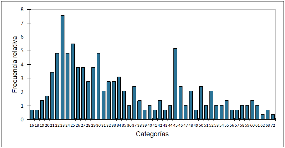 | Categorías | Frecuencia por categoría | Frecuencia relativa por categoría (%) | |