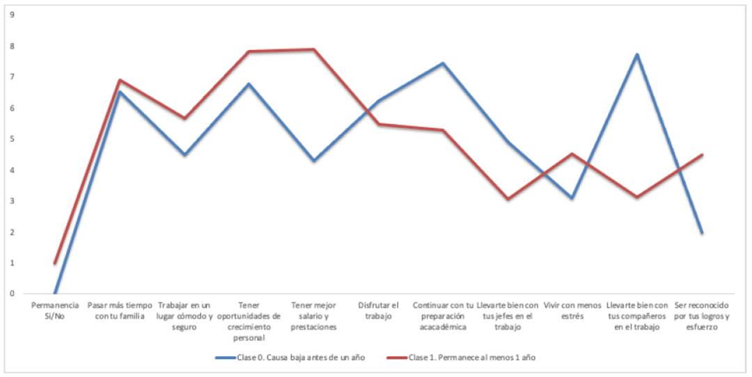 El grupo con tendencia a permanecer en el empleo (1) muestra valores medios (centroides) más altos en las variables pasar más tiempo con la familia, trabajar en un lugar cómodo y seguro, tener oportunidades de crecimiento laboral y tener mejor salario y prestaciones, vivir con menos estrés y ser reconocido por sus logros y esfuerzo. En tanto, el grupo con tendencia a rotar (0) muestra valores más elevados en las variables disfrutar del trabajo, continuar con tu preparación académica, llevarte bien con tus jefes y llevarte bien con tus compañeros.