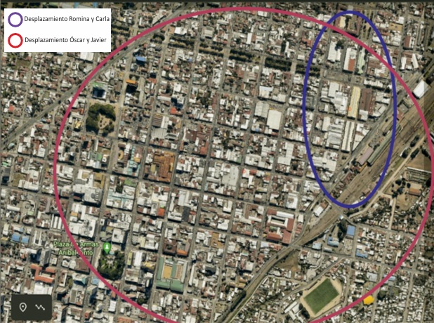 En relación con los espacios que habitan y por los que se desplazan, se reconoció que las mujeres poseen un limitado movimiento desde los puntos que consideran su hogar. Dadas la inseguridad y las experiencias de violencias sufridas en calle, ellas buscan recursos o relaciones en los alrededores próximos. Además, las restricciones asociadas a los roles de género en el espacio privado, terminan reduciendo sus posibilidades de obtener vínculos e ingresos que les permitan en un futuro salir de la situación de calle. Este panorama es distinto a lo expresado y observado en los hombres, quienes poseen, en términos comparativos, un rango mayor de desplazamientos (Figura 2), pues no están anclados al punto que habitan, y su percepción de inseguridad se centra en agresiones por discusiones o peleas con otras personas en situación similar, originadas generalmente por la influencia del alcohol.