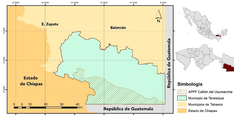 El municipio de Tenosique, Tabasco, es muy importante por ser un territorio transfronterizo entre México y Guatemala. En este se ubica parte de una de las mayores reservas de agua dulce del país por su elevado régimen de precipitación pluvial. La combinación de humedad con altas temperatura entre otros elementos favoreció la presencia de extensas zonas de cobertura de selva alta perennifolia y con ello la presencia de una gran diversidad biológica (Isaac-Márquez et al., 2005; Soares y García, 2017). Esta característica favorece el papel del Área de Protección de Flora y Fauna “Cañón del Usumacinta” como parte del corredor biológico mesoamericano (Arriaga et al., 2000; SEGOB, 2008).
