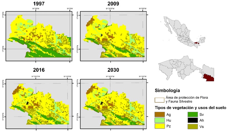 Ante la importancia estratégica de esta área natural protegida para la conservación, el objetivo de este trabajo fue modelar el cambio de uso del suelo en el municipio de Tenosique, Tabasco en los periodos (1997-2009-2016) y construir un escenario probabilístico y espacial al 2030.