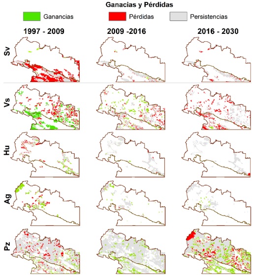 Una vez transformadas las capas vectoriales a ráster, se utilizó el LCM para realizar el análisis espacio temporal en dos periodos de tiempo de 1997 a 2009 y de 2009 a 2016. Para ello se ejecuta un cruce de capas que permite identificar pixel por pixel, los cambios de un periodo a otro y calcular de esta forma la superficie ganada o perdida, así como identificar qué tipo de uso del suelo le sustituye (transiciones), (Eastman y Toledano, 2018).