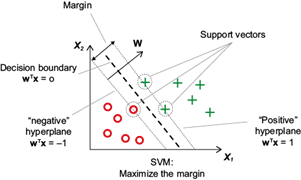 Fig. 2 Graphic representation of the support vector machine’s (SVM) work and the intention to maximize the margin. Obtained from Raschka (2015).