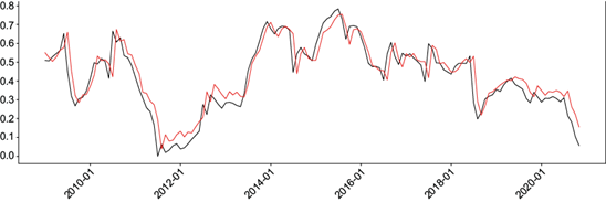 Fig. 3 Graph of actual SPEI values (black line) and predicted values (red line) from the Support Vector Regression (SVR) model for SPEI 12. Both with scaled gamma, C = 1, Degree = 1, and polynomial kernel. (SPEI: standardized precipitation evapotranspiration index.)