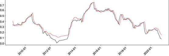 Fig. 4 Graph of real (black line) and predicted (red line) SPEI values from the LSTM model for SPEI 24 with 32-32-32 neurons. (SPEI: Standardized Precipitation Evapotranspiration Index; LSTM: Long-Short Term Memory).