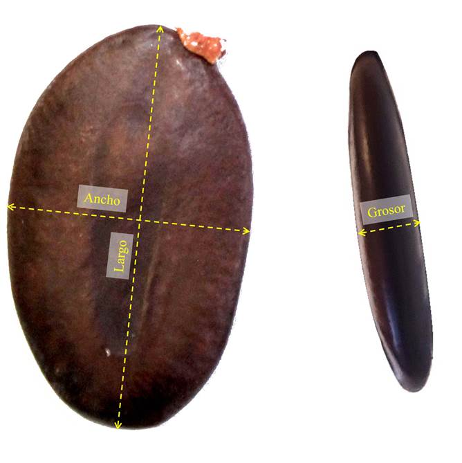La caracterización cualitativa consistió en describir el color de la cubierta seminal y la forma de las semillas. El color se determinó con cartas de colores Munsell® únicamente en una muestra de 50 semillas. Para la forma se calculó el índice de redondez (IR) mediante la relación entre el largo y ancho de las semillas; por lo tanto, si IR=1 es esférica, IR>1 es alargada u oblonga, e IR<1 es ovoide más larga que ancha (Aguirre-Dugua et al., 2012). Para la caracterización morfométrica, las dimensiones se determinaron con un calibrador digital Mitutoyo® Digimatic CD-4” AX (Mitutoyo America Corporation, Aurora, Illinois, EUA). El largo de las semillas se midió desde el extremo hilar hasta el extremo calazal, el ancho se midió en la porción media y más ancha de la semilla, y el grosor en el centro del pleurograma presente en ambos costados de la semilla (Fig. 2). El peso se registró con una báscula digital con precisión de 0. 01 g (iBalance® i2001, MyWeigh® (HBI International, Phoenix, Arizona, EUA)). Además de los datos de largo y ancho de las semillas previamente registrados para calcular la redondez, se midió el grosor (mm) y el peso (g), como parte de las evaluaciones sugeridas por Romero-Saritama y Pérez Ruiz (2016) para caracterizar los rasgos morfológicos de las semillas. Estas mediciones (largo, ancho, grosor y peso) se realizaron en una muestra aleatoria de 500 semillas (50 por cada uno de los 10 árboles). Al momento de la evaluación, la semilla presentaba una humedad de 7-9%, estimada mediante la metodología descrita por Viveros Viveros et al. (2015) que consiste en la determinación en muestras de 5 g de semillas enteras secadas dentro de recipientes en un horno de secado a 103 °C durante 17 h.