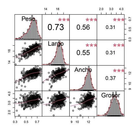 Figura 4: Análisis de correlación de Pearson entre características de tamaño (largo, ancho y grosor) y el peso de semillas de Peltogyne mexicana Martínez recolectadas en la localidad de Tierra Colorada, municipio Juan R. Escudero, Guerrero, México (N = 500; α = 0.05).