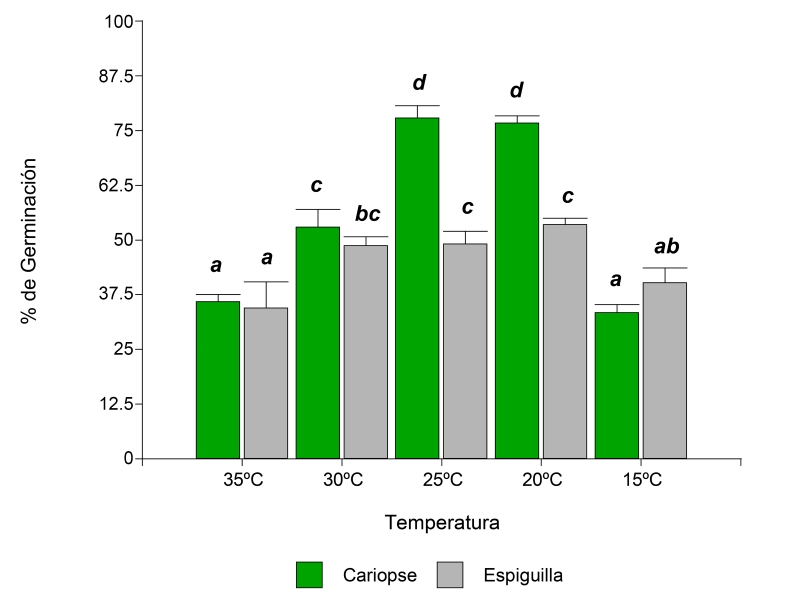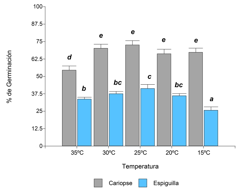 Figura 3: Porcentajes de germinación de la especie Digitaria californica (Benth.) Henrard en la interacción de los factores tipo de propágulo (cariopse, espiguilla) y temperatura (15, 20, 25, 30 y 35 °C). Letras diferentes sobre las columnas indican diferencias significativas entre los valores medios de los tratamientos de acuerdo con la prueba a posteriori de LSD Fisher (α<0.05).