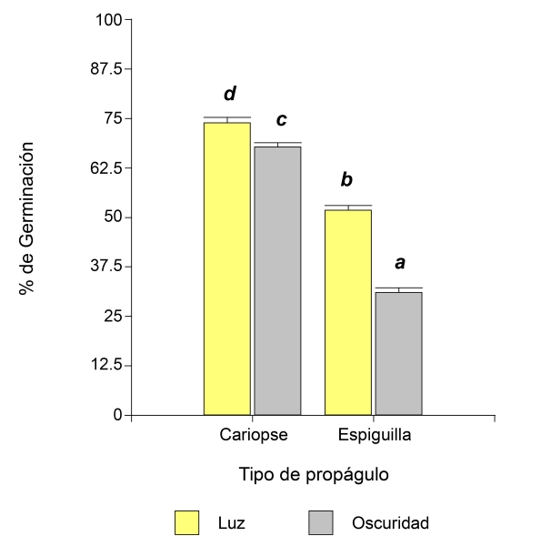 Figura 2: Porcentajes de germinación de la especie Pappophorum caespitosum Fries en la interacción de iluminación (luz, oscuridad) y tipo de propágulo (cariopse, espiguilla). Letras diferentes sobre las columnas indican diferencias significativas entre los valores medios de los tratamientos de acuerdo con la prueba a posteriori de LSD Fisher (α˂0.05).