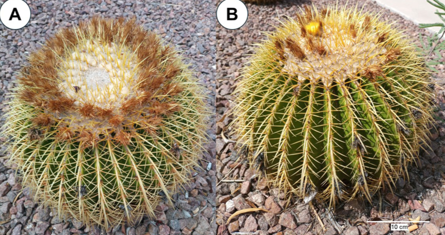 En septiembre 2022 se obtuvieron aproximadamente 300 semillas de cada uno de los 10 frutos maduros obtenidos de dos individuos (30 cm de diámetro y 22 cm de altura) de K. grusonii (Fig. 1). Estas plantas crecen decorando los jardines urbanos de un centro comercial de El Paso, Texas, Estados Unidos de América (31°46'08''N, 106°22'09''O). Según Gold et al. (2004), 500-1000 semillas es un número adecuado de colecta para estudios de germinación.