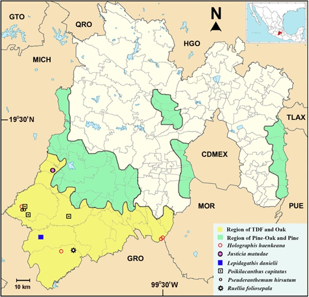 Rzedowski (1981) recognized five major vegetation types (or biotic communities) in the state: thornscrub (matorral xerófilo), thorn forest (bosque espinoso), tropical deciduous forest (bosque tropical caducifolio), pine-oak forest (bosque de pino y encino), and various grassland associations formations (pastizal). Smaller regions of additional biotic communities noted in the state by collectors of Acanthaceae and outlined in more detailed vegetation maps of the state (e.g., Fig. 2.13 in Hernández-Cesár, 2020; Mapa 13 in INEGI, 2024; 2025) include tropical subdeciduous forest, oak forest, and mesophytic montane forest. Acanthaceae are present in all of these communities, and occur at elevations from 440 to 2830 m. Most (at least 34 of the 55 native species) occur in regions of tropical deciduous forest (often in riparian habitats) at elevations below 2000 m. Figure 1 shows regions of the state dominated by tropical dry forest/oak forest and oak forest/pine-oak forest. Elsewhere in the state smaller regions of other biotic communities occur among human-altered landscapes.