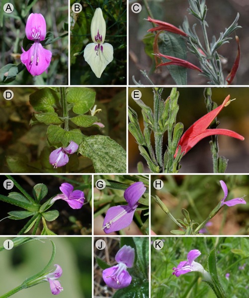 31b. Corollas red, orange, or pink, and often with white markings on lower lip, if sometimes greenish yellow (i.e., J. salviiflora) then 13-21 mm long and lacking a curved apex in bud; pollen with 1-4 rows of large and reticulate insulae and/or peninsulae on each side of apertures (Appendix 1: Fig. 3G, H) ............................................................................................................................... 32