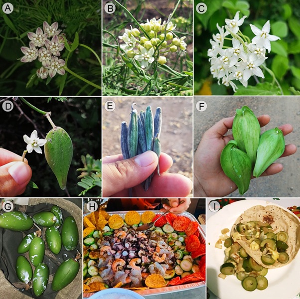 Figura 1: Especies de Asclepiadoideae evaluadas en el presente estudio. A, E. Funastrum heterophyllum (Engelm. ex Torr.) Standl.; B, D. Funastrum clausum (Jacq.) Schltr.; C. Funastrum pannosum (Decne.) Schltr.; F. Gonolobus naturalistae M.G. Chávez, Pío-León & L.O. Alvarado; G. Ruehssia tholiformis (Juárez-Jaimes & L.O. Alvarado) L.O. Alvarado; H, I. Diferentes formas de preparación para consumo de los frutos de Ruehssia tholiformis y otras especies de Ruehssia en Sinaloa, México. Fotos de Juan Fernando Pío León (A-F, G, I) y Gabriela López Angulo (H).
