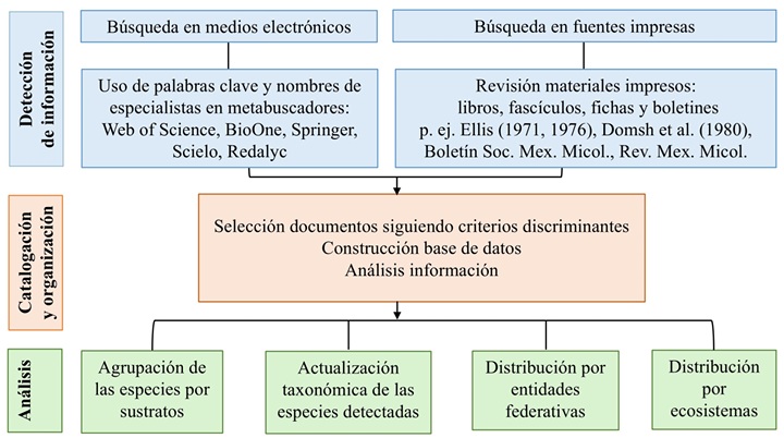 Para construir la cadena de búsqueda junto con las palabras clave se emplearon los operadores booleanos AND, OR, NOT. De forma complementaria, se realizaron exploraciones dirigidas con los nombres de micólogos especialistas que han realizado investigaciones en diversas regiones de México y que estudian grupos taxonómicos en los que se incluyen especies de micromicetos saprobios. La búsqueda no se limitó a un periodo de tiempo. De cada documento se extrajo la siguiente información: autor(es), año de publicación, fuente bibliográfica, especie, sustrato, localidad, entidades federativas y tipo de ecosistema.