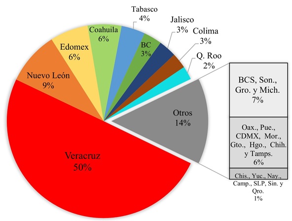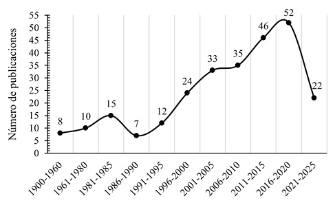 La información presentada se fundamenta en la recopilación y análisis de 266 documentos publicados entre 1900 y 2025 (Fig. 2), provenientes de 22 fuentes editadas en México y 59 en el extranjero. De estas fuentes, se consideraron 122 y 144 publicaciones, respectivamente. Aunque se ha procurado una revisión exhaustiva, no se descarta la posible omisión de algunas contribuciones, ya sea por haber sido difundidas en medios de circulación limitada o por haberse publicado durante la etapa final de elaboración de este análisis. En el Cuadro 1 se incluyen solo las fuentes bibliográficas en las que fueron detectados al menos cinco trabajos cuya información se integró en la presente revisión. En el Apéndice 1 se incluye una lista con las referencias de todos los documentos considerados para el análisis. En total se obtuvieron 3242 registros, que incluyen 1620 especies y 739 géneros distintos de micromicetos, recolectados en todas las entidades federativas de México (material suplementario con la lista de las especies consideradas en el análisis), exceptuando Tlaxcala y Zacatecas, en donde no se encontraron registros (Cuadro 2).