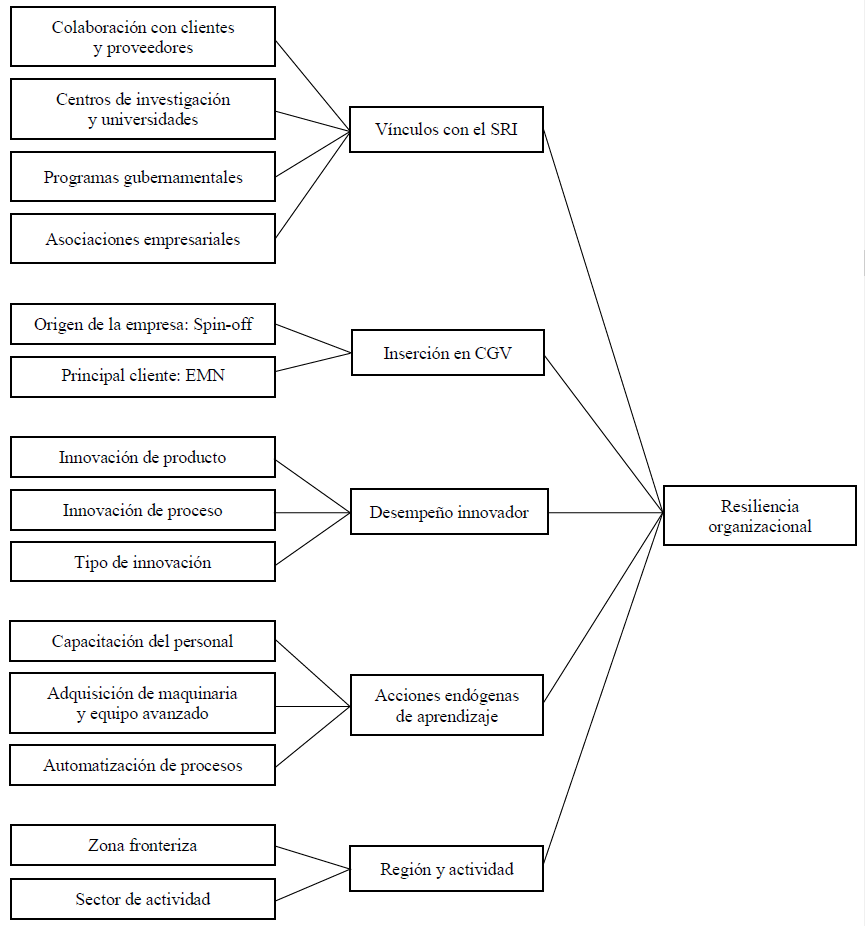 De la literatura sobre CGV y SI surgen algunas variables relevantes para la definición de un esquema analítico en la explicación de la resiliencia organizacional en el caso especifico de las pymes intensivas en conocimiento.