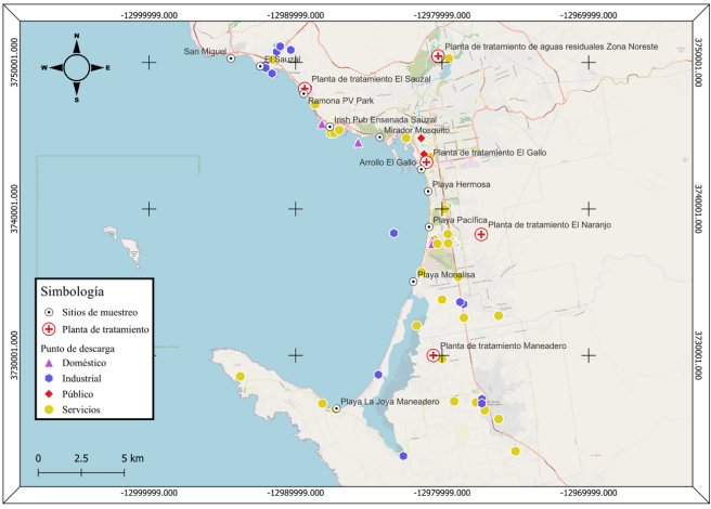 Mapa 1. Plantas de tratamiento, puntos de descarga y sitios de muestro en la bahía de Ensenada