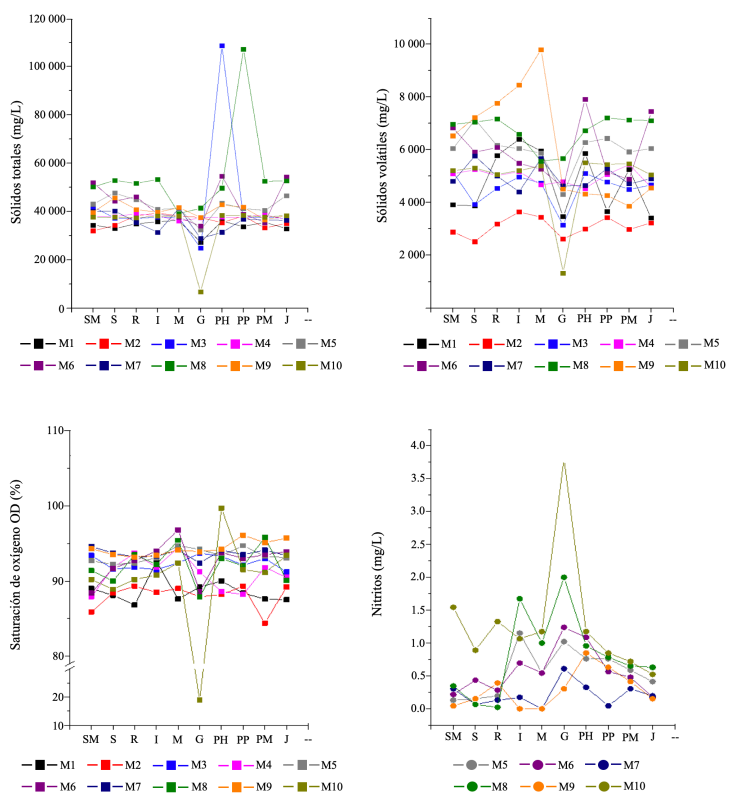 Si a estas evidencias se agregan los resultados de los muestreos realizados en el marco de la presente investigación –aunque no puedan ser concluyentes por las limitaciones de representatividad en espacio y temporalidad–, se encuentra que las descargas de la planta de tratamiento «El Gallo» son el punto donde hay una tendencia a que los parámetros analizados –nitritos, porcentaje de saturación de oxígeno, sólidos volátiles y sólidos totales–7 sobrepasen los LMP (figura 2). Esto se debe a que en dicho punto se conjugan los afluentes de 16 empresas, que representan el 62 por ciento de las industrias que contratan los servicios de la CESPE, así como otros afluentes domésticos que desembocan en el arroyo mencionado y afectan Playa Hermosa (De Basabe, 2022), constatando los problemas recurrentes de contaminación en la misma.