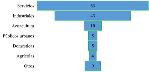 Es necesario reconocer que los problemas de contaminación en la bahía de Ensenada integran tanto los posibles impactos de las descargas domésticas como las no domésticas. Sin embargo, se plantea que las aguas residuales industriales representan un riesgo potencial mayor, derivado de las cargas contaminantes en sus procesos (WWAP, 2017), por ello, es medular conocer y entender su gestión. De acuerdo con la información del Repda, se encontraron 139 permisos de descarga, clasificados en 63 de servicios, 43 industriales, 10 de acuacultura, cinco domésticos, cinco urbanos, cuatro agrícolas y nueve clasificados como «otros» (gráfica 2). Si se ahonda en la clasificación del Repda se constata que no es clara, pues no justifica cómo en las industrias de servicios se encuentran las pesquerías y empacadoras, ni tampoco existe una clasificación por tipos de descarga y contaminantes, que podría ser muy útil para la toma de decisiones.