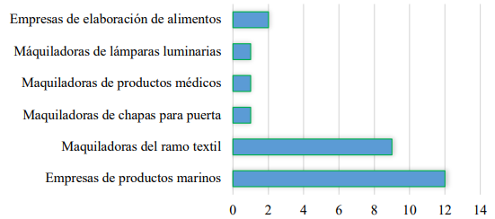 Como se observa en la gráfica 3, la CESPE tiene un papel fundamental en el puerto de Ensenada, al tratar las aguas residuales de las empresas más pequeñas, que conforman casi una quinta parte de la industria y que buscan el cumplimiento de las normas ambientales. Las principales son empresas de productos marinos, 12 en total; nueve maquiladoras del ramo textil; dos empresas dedicadas a la elaboración de alimentos; una maquiladora de lámparas luminarias; una maquiladora de productos médicos; y una maquiladora de chapas para puerta.