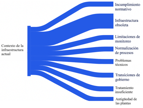 Ambos procedimientos normativos, federal y local, aunque tienen cierto paralelismo en sus requerimientos de solicitud de permisos, no se complementan, lo que limita la coordinación institucional en el tratamiento de aguas industriales en ambas instancias (De Basabe, 2022), destacando que la parte local se encuentra subordinada a la federal. Esta falta de coordinación evidencia que los OOA van resolviendo problemas urgentes dentro de un sistema financiero que no les permite atender los problemas de fondo y con autonomía, y que sus preocupaciones fundamentales se relacionan con la infraestructura de las plantas: antigüedad, obsolescencia, impactos de transiciones gubernamentales y bajo nivel de mantenimiento (De Basabe, 2022) (figura 3). Es decir, los retos de la CESPE se vuelven complejos en un contexto de sistemas jerárquicos que no logra una cooperación horizontal en la toma de decisiones.