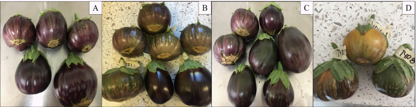 Figura 1 Frutos de berenjena con distintas dosis de selenio: A) 0 μM, B) 10 μM, C) 30 μM y D) 60 μM. Con dosis de 90 μM no se obtuvieron frutos.