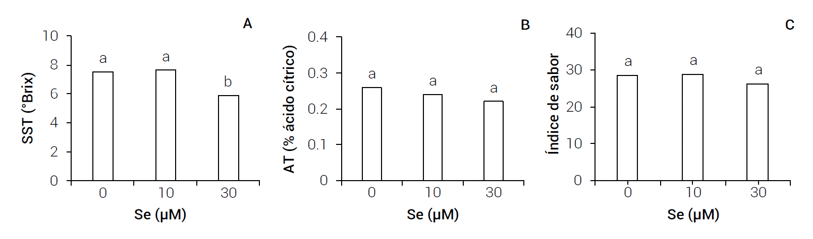 Figura 2 Efecto de diferentes dosis de selenio en: A) sólidos solubles totales, B) acidez titulable y C) índice de sabor en frutos de berenjena. Medias con letras iguales no son estadísticamente diferentes (Tukey, P ≤ 0.05). Con dosis de 60 y 90 μM no se obtuvieron muestras de frutos en cantidad suficiente.
