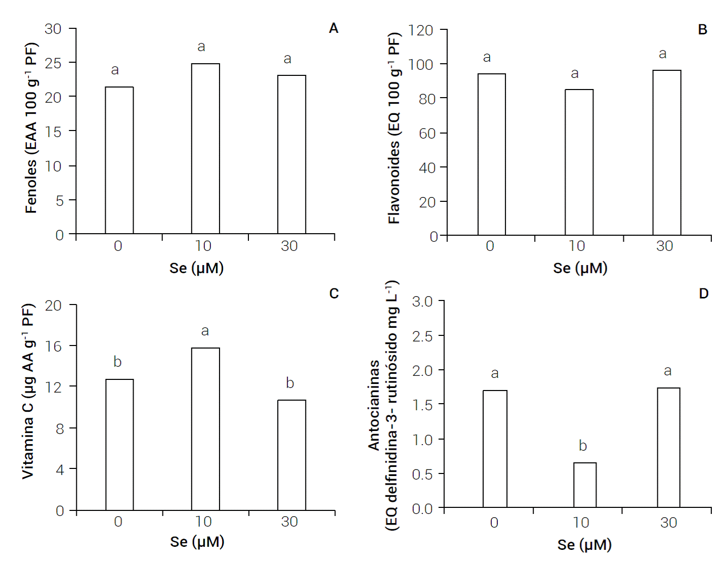 Figura 3 Efecto de diferentes dosis de selenio en: A) fenoles, B) flavonoides, C) vitamina C, y D) antocianinas en frutos de berenjena. Medias con letras iguales no son estadísticamente diferentes (Tukey, P ≤ 0.05). Con dosis de 60 y 90 μM no se obtuvieron muestras de frutos en cantidad suficiente.