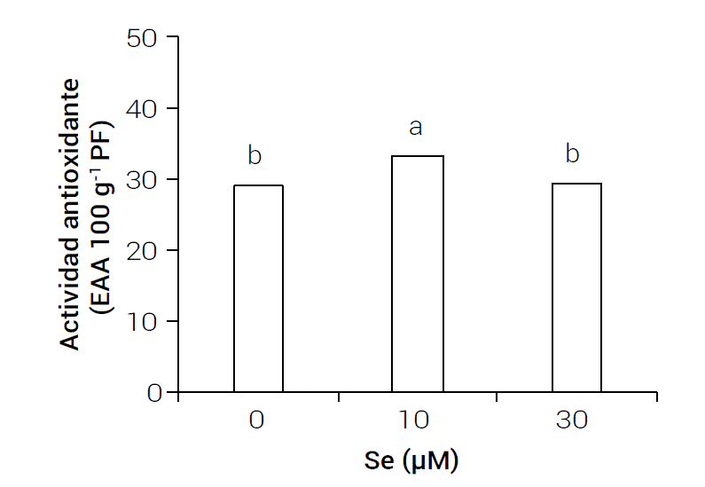 Figura 4 Efecto de dosis de selenio en la actividad antioxidante en frutos de berenjena. Medias con letras iguales no son estadísticamente diferentes (Tukey, P ≤ 0.05). Con dosis de 60 y 90 μM no se obtuvieron muestras suficientes de frutos.