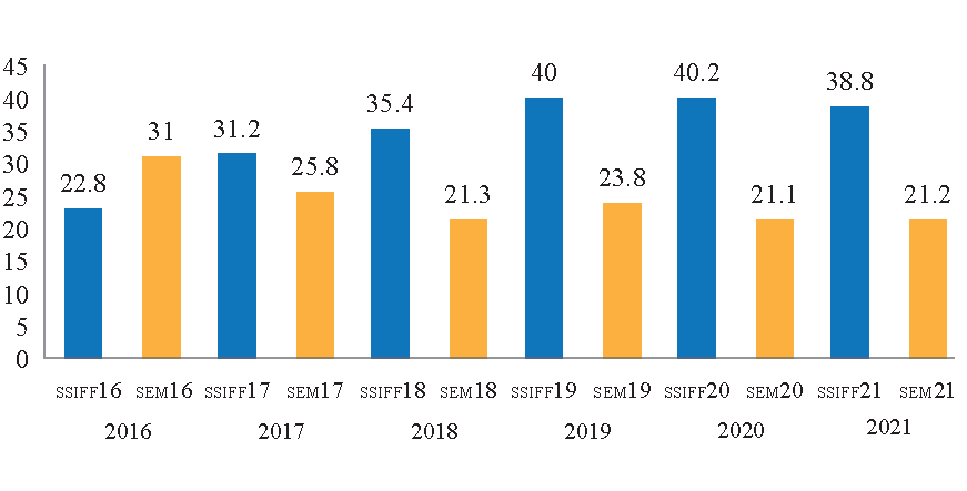 Figura 2 Porcentaje de películas de world cinema proyectadas en el SSIFF y la Seminci (2016-2021)