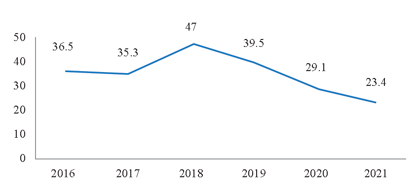 El auge del cine argentino en España en la década de los 2000 fue la causa del crecimiento de las coproducciones hispano-argentinas, que, según la estimación del mismo autor, en los años 2000-2009 alcanzaron los 131 títulos, “lo que representa más del 44 % del total de coproducciones con Latinoamérica en esta década” (p. 17). La Figura 7 muestra la todavía buena salud de la coproducción hispano-argentina en el periodo de este estudio (2016-2021), lo que demuestra una continuación con respecto a la década anterior, estudiada por Elena.