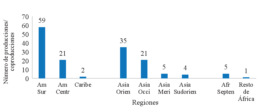 Como muestra la Figura 4, la región que produjo o coprodujo el mayor porcentaje de películas proyectadas en los dos festivales que finalmente se exhibieron en salas fue América del Sur, con 59 películas; seguida de Asia Oriental, con 35 películas, y América Central y Asia Occidental, ambas con 21 películas. Cabe señalar que, en algunos casos, todos los países implicados en las coproducciones pertenecían a la misma región geográfica.