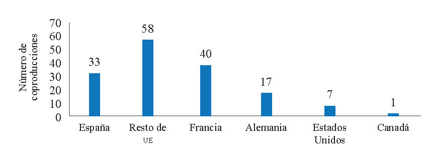En este sentido, cabe aclarar que, entre estas coproducciones, como muestra la Figura 8, más de la mitad de las coproducciones españolas fueron con un único país. Una posible explicación podría estar relacionada, tal y como plantea Bondebjerg (2016), con el hecho de que las coproducciones transnacionales audiovisuales, cuando involucran más de dos sistemas nacionales de producción, pueden generar no solo ventajas, sino también inconvenientes, ya que las diferentes “formas nacionales de dirigir o los diferentes estilos de actuación” pueden colisionar (p. 5).