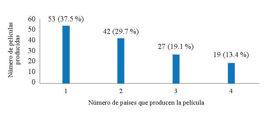 Como puede verse en la Figura 6, el mayor número de películas que llegaron a las salas fueron producciones de un solo país, seguidas de las de dos países, tres países y cuatro o más países.
