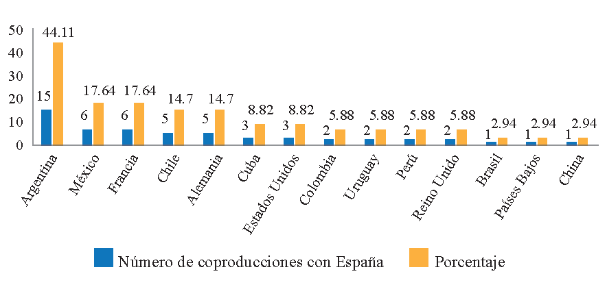 Si nos centramos en España, podemos observar que el país con el que más coproduce es Argentina (44 % de las coproducciones españolas de largometrajes en festivales), seguido de México y Francia (17.6 %). Según datos de UIS. Stat (2022), de 2005 a 2017, Argentina ocupa un lugar privilegiado en el régimen de coproducción de largometrajes de ficción con España. Un contexto histórico de este hecho fue estudiado por Elena (2011), quien consideró la década de los 2000 como una “verdadera edad de oro” de estrenos del cine argentino en España, muy por encima de otros cines sudamericanos (p. 4).