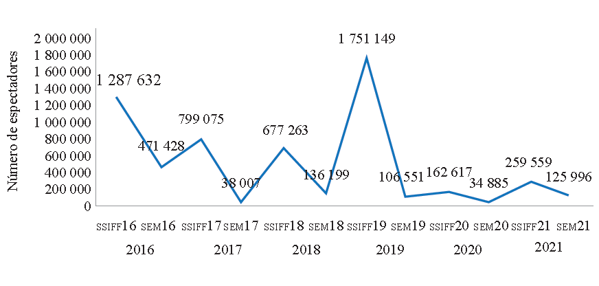 Fuente: Elaboración propia con datos extraídos de la programación de SSIFF y Seminci (2016 a 2021) y del ICAA (2022a).