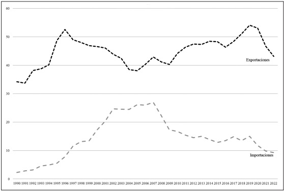 ii) 2008-2022. Las importaciones decrecen sistemáticamente; mientras las exportaciones experimentan dos trayectos; al inicio, aun con la crisis financiera iniciada en 2008 por las hipotecas subprime de los EE. UU., registra durante una década un ascenso significativo [2009-2019]; luego, a partir de la negociación y arranque del TMEC, así como la pandemia de la Covid-19, un descenso sustancial [2020-2022]. En efecto, la evolución inicia con un saldo comercial estrecho y culmina, al igual que en el inicio del ciclo [1990-2022], con una brecha amplia y positiva en términos de exportaciones netas.