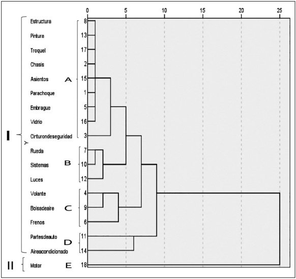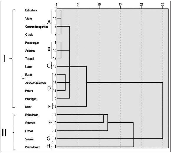 El análisis por conglomerados (Dendrograma 1) muestra que el grupo único de partes de auto engloba todas las pequeñas, medianas y grandes piezas que conforman un automóvil (0.18 por ciento), con un valor significativo.