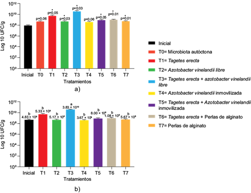 | T4 (Azotobacter vinelandii inmovilizada) | 7 229.85 ± 543.22ab | 25.60 ± 11.91 | 3.67 × 108 ± 1.15 × 108 b |