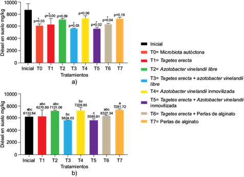 Fig. 2 Remoción de diésel en los diferentes tratamientos. (a) Prueba T pareada respecto a la concentración de suelo inicial (*tratamientos estadísticamente significativos); (b) análisis de varianza de una vía para comparar los diferentes tratamientos (p = 0.05).