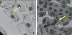 La evaluación de citotoxicidad y genotoxicidad a los tratamientos se realizó utilizando Allium sativum como bioindicador, mediante la determinación del índice mitótico y el conteo de anormalidades nucleares y micronúcleos (Fiskesjö 1985). Los bulbos de A. sativum fueron expuestos durante siete días al suelo inicial y residual de cada tratamiento; posteriormente se realizaron cortes de 1-3 mm de la zona del meristema apical de las raíces, los cuales se fijaron con una solución 1:3 de ácido acético y etanol. Ulteriormente se realizó la hidrólisis de las muestras, colocándolas en una solución de ácido clorhídrico 1 N a 50 ºC durante 5 min. La tinción de raíces se realizó en un portaobjetos con orceína al 2 % durante 2 min. Finalmente se realizó el aplastado celular (squashing) de cada muestra con ayuda de un cubreobjetos. Los preparados citológicos se manejaron en simple ciego y se identificaron 1000 células meristemáticas para cada tratamiento. Las células se cuantificaron en cualquier fase de mitosis, al igual que las aberraciones cromosómicas, utilizando un microscopio óptico de fluorescencia Leica DM1000 LED. Por último, se calculó el índice mitótico (IM), y los resultados de anormalidades nucleares obtenidos se sometieron a prueba de χ2 para asociar la genotoxicidad presentada en células de Allium sativum.