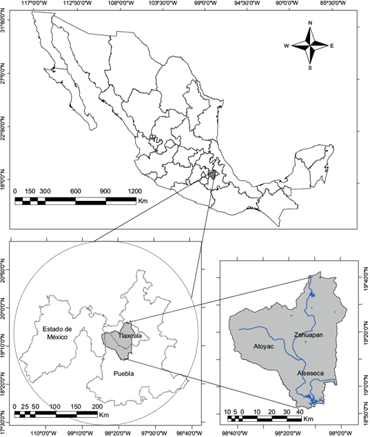 La Cuenca del Alto Atoyac, abarca parte de los estados de Puebla y Tlaxcala y una pequeña porción de la Sierra Nevada que pertenece al Estado de México (Fig. 1); alberga al 70 % de toda la población de Tlaxcala y el 40 % de la población de Puebla, sumando un total de 3 857 882 habitantes (INEGI 2020a). En esta área se encuentran las principales zonas metropolitanas de ambos estados que incluyen a sus capitales y a otros municipios. En la investigación se consideraron 67 municipios: 20 de Puebla y 47 de Tlaxcala.