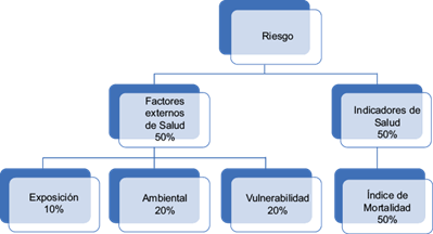 Se desarrolló el índice de riesgo a nivel municipal, el cual fue inspirado por el Modelo de Rankings de Salud del Instituto de Salud Pública de la Universidad de Wisconsin de los Estados Unidos de América (CHRM 2014). De forma similar al modelo, se consideraron dos tipos de factores: los que indican la situación de salud en la CAA y los factores externos que pueden incidir sobre la salud de la población a futuro. El indicador de la salud corresponde al índice de mortalidad; mientras que los factores externos se dividieron en tres: exposición (logaritmo del tamaño de la población), ambiental (peligros potenciales-fuente de contaminantes) y vulnerabilidad social (Fig. 2).