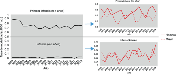 En la CAA, las MC figuran entre las principales causas de muerte en la población de 0 a 9 años, representando el 37 % del total de los fallecimientos por enfermedades crónicas no transmisibles (ECNT). En la figura 3 se puede observar que la mayoría de las muertes ocurren durante la primera infancia (0-4 años), afectando en mayor medida a la población infantil masculina.